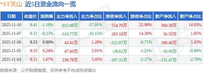 证券之星消息,截至2025年11月10日收盘,*ST天山(300313)报收于8.41元,下跌1.18%,换手率1.45%,成交量2.87万手,成交额2413.62万元。