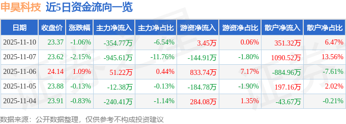 11月10日的资金流向数据方面,主力资金净流出354.77万元,占总成交额6.54%,游资资金净流入3.45万元,占总成交额0.06%,散户资金净流入351.32万元,占总成交额6.47%。