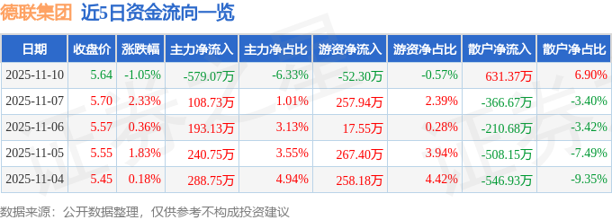 证券之星消息,截至2025年11月10日收盘,德联集团(002666)报收于5.64元,下跌1.05%,换手率3.23%,成交量16.19万手,成交额9151.16万元。
