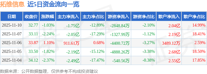 证券之星消息,截至2025年11月10日收盘,拓维信息(002261)报收于32.77元,下跌1.03%,换手率3.62%,成交量41.48万手,成交额13.59亿元。