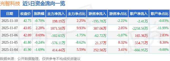 证券之星消息,截至2025年11月10日收盘,光智科技(300489)报收于42.75元,下跌0.7%,换手率1.49%,成交量2.05万手,成交额8819.12万元。