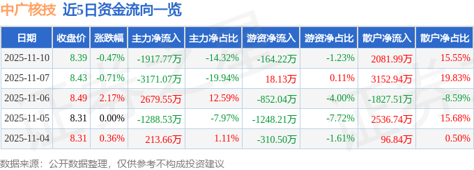 证券之星消息,截至2025年11月10日收盘,中广核技(000881)报收于8.39元,下跌0.47%,换手率1.9%,成交量15.99万手,成交额1.34亿元。