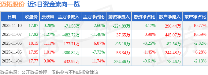 证券之星消息,截至2025年11月10日收盘,迈拓股份(301006)报收于17.87元,下跌0.28%,换手率1.78%,成交量1.53万手,成交额2751.82万元。