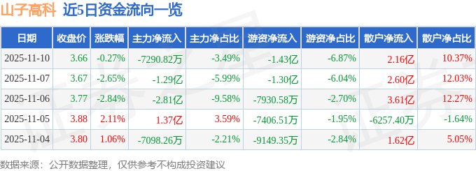 证券之星消息,截至2025年11月10日收盘,山子高科(000981)报收于3.66元,下跌0.27%,换手率6.03%,成交量573.3万手,成交额20.86亿元。