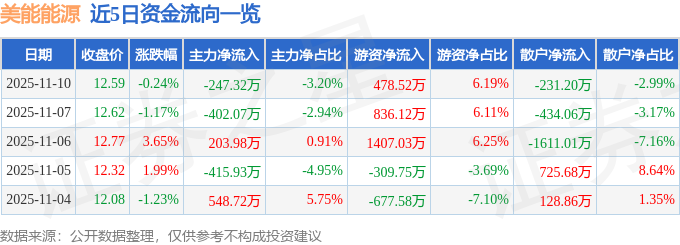 证券之星消息,截至2025年11月10日收盘,美能能源(001299)报收于12.59元,下跌0.24%,换手率2.83%,成交量6.18万手,成交额7724.93万元。