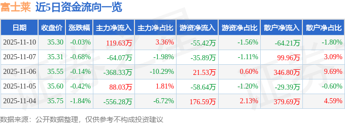 11月10日的资金流向数据方面,主力资金净流入119.63万元,占总成交额3.36%,游资资金净流出55.42万元,占总成交额1.56%,散户资金净流出64.21万元,占总成交额1.8%。