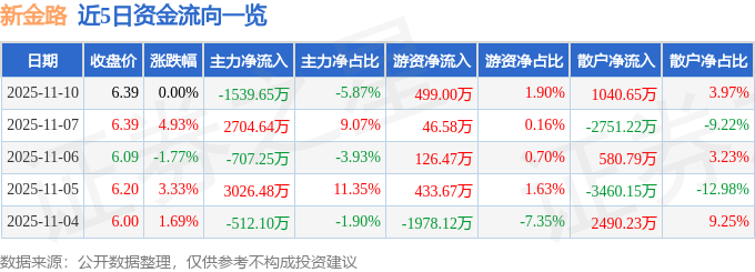证券之星消息,截至2025年11月10日收盘,新金路(000510)报收于6.39元,上涨0.0%,换手率6.7%,成交量40.62万手,成交额2.62亿元。