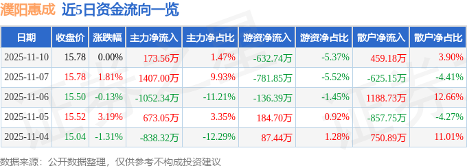 证券之星消息,截至2025年11月10日收盘,濮阳惠成(300481)报收于15.78元,上涨0.0%,换手率2.57%,成交量7.46万手,成交额1.18亿元。