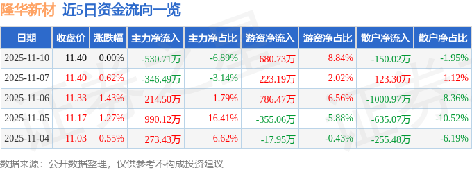 证券之星消息,截至2025年11月10日收盘,隆华新材(301149)报收于11.4元,上涨0.0%,换手率2.59%,成交量6.77万手,成交额7703.44万元。