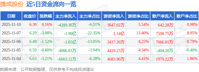 证券之星消息,截至2025年11月10日收盘,捷成股份(300182)报收于6.3元,上涨0.16%,换手率4.62%,成交量104.27万手,成交额6.58亿元。