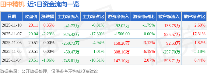 11月10日的资金流向数据方面,主力资金净流出41.73万元,占总成交额0.81%,游资资金净流出92.02万元,占总成交额1.79%,散户资金净流入133.75万元,占总成交额2.6%。