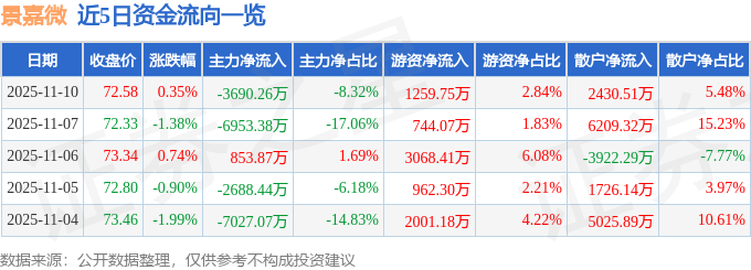 证券之星消息,截至2025年11月10日收盘,景嘉微(300474)报收于72.58元,上涨0.35%,换手率1.5%,成交量6.11万手,成交额4.43亿元。