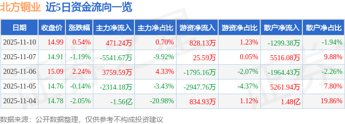 证券之星消息,截至2025年11月10日收盘,北方铜业(000737)报收于14.99元,上涨0.54%,换手率2.35%,成交量44.73万手,成交额6.71亿元。