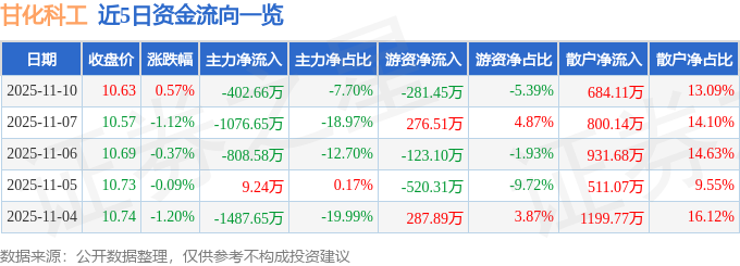 证券之星消息,截至2025年11月10日收盘,甘化科工(000576)报收于10.63元,上涨0.57%,换手率1.13%,成交量4.91万手,成交额5225.97万元。