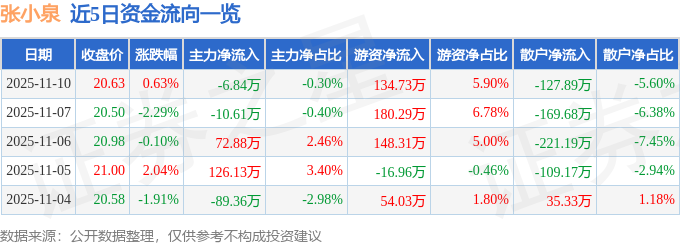 11月10日的资金流向数据方面,主力资金净流出6.84万元,占总成交额0.3%,游资资金净流入134.73万元,占总成交额5.9%,散户资金净流出127.89万元,占总成交额5.6%。