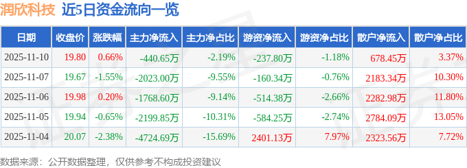 证券之星消息,截至2025年11月10日收盘,润欣科技(300493)报收于19.8元,上涨0.66%,换手率2.02%,成交量10.23万手,成交额2.02亿元。