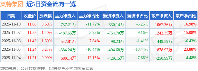 11月10日的资金流向数据方面,主力资金净流出737.21万元,占总成交额11.72%,游资资金净流出330.14万元,占总成交额5.25%,散户资金净流入1067.36万元,占总成交额16.98%。