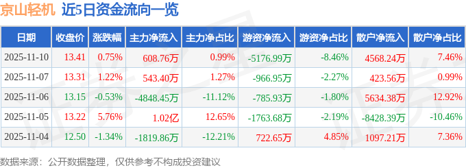 证券之星消息,截至2025年11月10日收盘,京山轻机(000821)报收于13.41元,上涨0.75%,换手率7.41%,成交量44.78万手,成交额6.12亿元。