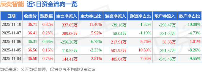 证券之星消息,截至2025年11月10日收盘,辰奕智能(301578)报收于36.71元,上涨0.82%,换手率3.5%,成交量8108.0手,成交额2962.14万元。