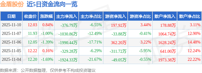 证券之星消息,截至2025年11月10日收盘,金盾股份(300411)报收于12.03元,上涨0.84%,换手率1.55%,成交量4.8万手,成交额5750.87万元。