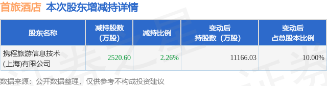 证券之星消息,11月10日首旅酒店发布公告《首旅酒店:北京首旅酒店(集团)股份有限公司关于持股5%以上股东权益变动触及1%刻度和5%整倍数的提示性公告》,其股东携程旅游信息技术(上海)有限公司于2025年11月10日合计减持2520.6万股,占公司目前总股本的2.2574%,变动期间该股股价上涨10.01%,截止11月10日收盘报16.15元。