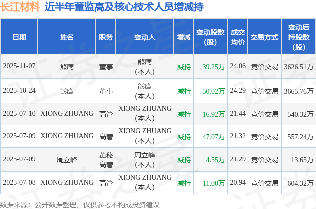 长江材料近半年内的董监高及核心技术人员增减持详情如下: