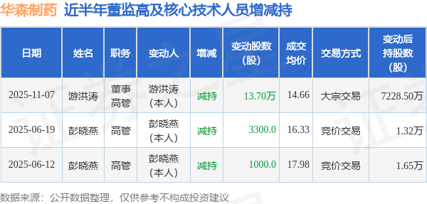 华森制药近半年内的董监高及核心技术人员增减持详情如下: