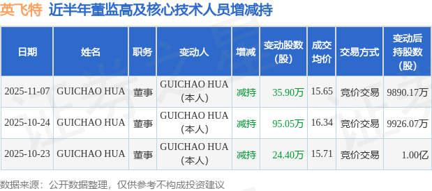 英飞特近半年内的董监高及核心技术人员增减持详情如下: