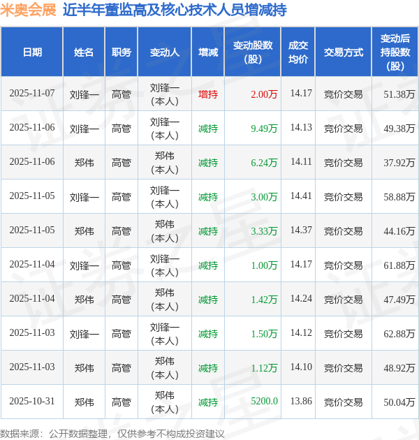 米奥会展近半年内的董监高及核心技术人员增减持详情如下: