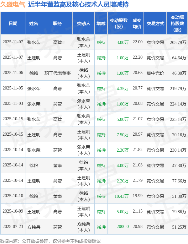 久盛电气近半年内的董监高及核心技术人员增减持详情如下: