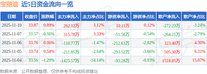 11月10日的资金流向数据方面,主力资金净流入262.12万元,占总成交额3.12%,游资资金净流入10.11万元,占总成交额0.12%,散户资金净流出272.23万元,占总成交额3.24%。