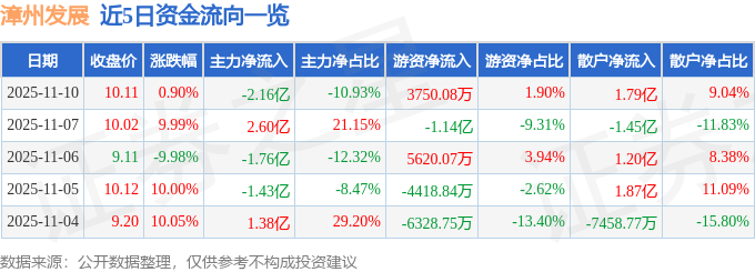 证券之星消息,截至2025年11月10日收盘,漳州发展(000753)报收于10.11元,上涨0.9%,换手率19.04%,成交量188.79万手,成交额19.78亿元。