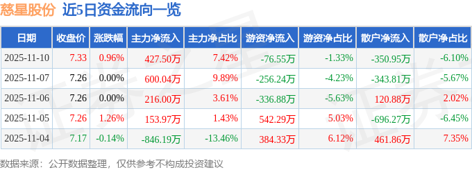 证券之星消息,截至2025年11月10日收盘,慈星股份(300307)报收于7.33元,上涨0.96%,换手率1.01%,成交量7.89万手,成交额5757.66万元。