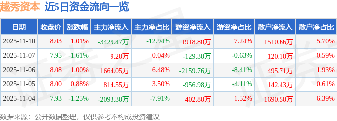 证券之星消息,截至2025年11月10日收盘,越秀资本(000987)报收于8.03元,上涨1.01%,换手率0.66%,成交量33.2万手,成交额2.65亿元。