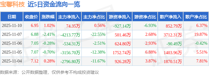 证券之星消息,截至2025年11月10日收盘,宝馨科技(002514)报收于6.95元,上涨1.02%,换手率3.47%,成交量19.23万手,成交额1.34亿元。