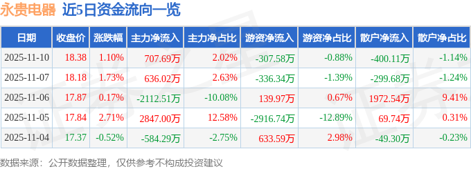 证券之星消息,截至2025年11月10日收盘,永贵电器(300351)报收于18.38元,上涨1.1%,换手率7.25%,成交量19.06万手,成交额3.5亿元。