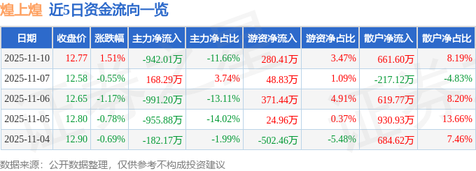 证券之星消息,截至2025年11月10日收盘,煌上煌(002695)报收于12.77元,上涨1.51%,换手率1.24%,成交量6.35万手,成交额8079.83万元。