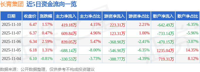 证券之星消息,截至2025年11月10日收盘,长青集团(002616)报收于6.47元,上涨1.57%,换手率2.68%,成交量15.71万手,成交额1.01亿元。