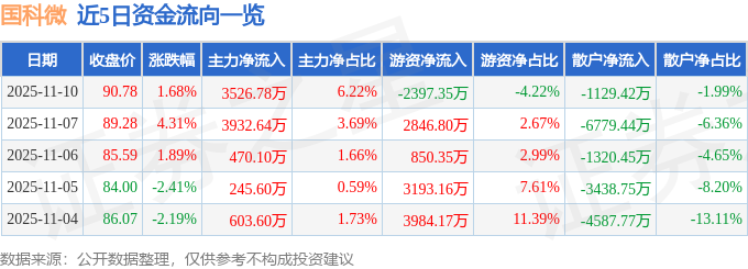 证券之星消息,截至2025年11月10日收盘,国科微(300672)报收于90.78元,上涨1.68%,换手率3.0%,成交量6.31万手,成交额5.67亿元。
