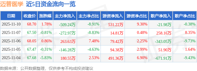 证券之星消息,截至2025年11月10日收盘,迈普医学(301033)报收于68.7元,上涨1.78%,换手率1.47%,成交量8315.0手,成交额5712.71万元。