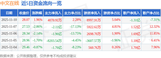 证券之星消息,截至2025年11月10日收盘,中文在线(300364)报收于28.07元,上涨1.96%,换手率9.56%,成交量63.13万手,成交额17.87亿元。