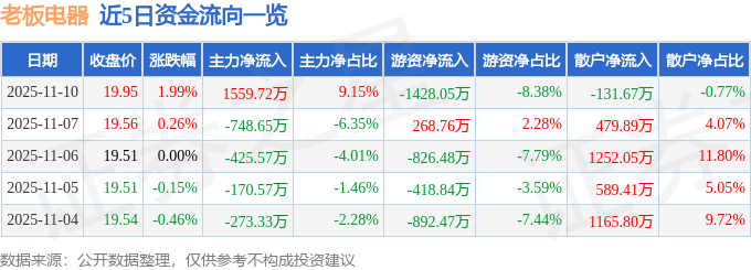 证券之星消息,截至2025年11月10日收盘,老板电器(002508)报收于19.95元,上涨1.99%,换手率0.92%,成交量8.59万手,成交额1.7亿元。