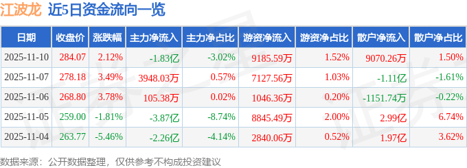11月10日的资金流向数据方面,主力资金净流出1.83亿元,占总成交额3.02%,游资资金净流入9185.59万元,占总成交额1.52%,散户资金净流入9070.26万元,占总成交额1.5%。