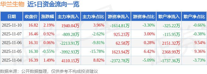 证券之星消息,截至2025年11月10日收盘,华兰生物(002007)报收于16.82元,上涨2.19%,换手率1.86%,成交量29.21万手,成交额4.9亿元。