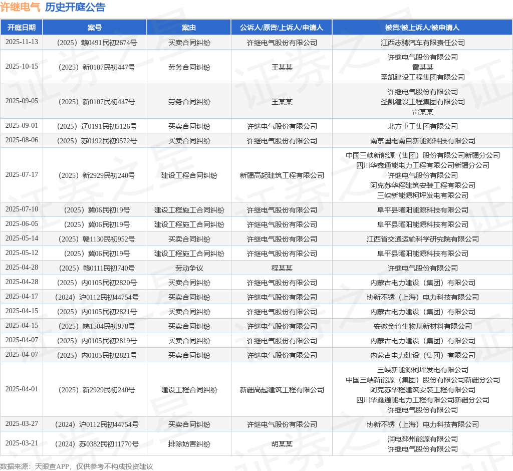 案号:(2025)赣0491民初2674号根据统计,近一年内以许继电气股份有限公司为当事人的历史开庭公告有32则,其中案由为“买卖合同纠纷”的公告以18则居首,其次为“建设工程合同纠纷”有3则,“建设工程施工合同纠纷”有3则。历史开庭公告(前20条)如下: