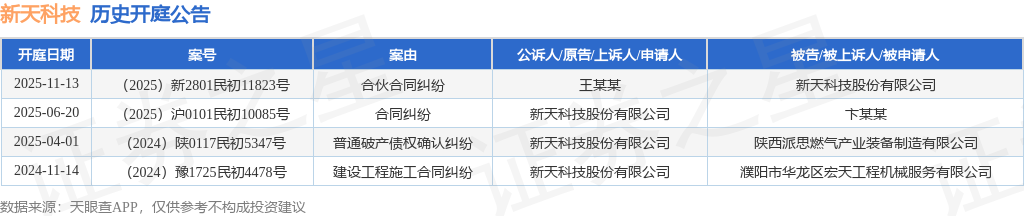 案号:(2025)新2801民初11823号根据统计,近一年内以新天科技股份有限公司为当事人的历史开庭公告有4则,其中案由为“合伙合同纠纷”的公告以1则居首,其次为“合同纠纷”有1则,“建设工程施工合同纠纷”有1则。历史开庭公告如下: