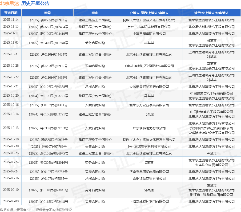 案号:(2025)苏0585民初12404号根据统计,近一年内以北京承达创建装饰工程有限公司为当事人的历史开庭公告有106则,其中案由为“买卖合同纠纷”的公告以30则居首,其次为“建设工程分包合同纠纷”有21则,“装饰装修合同纠纷”有13则。历史开庭公告(前20条)如下: