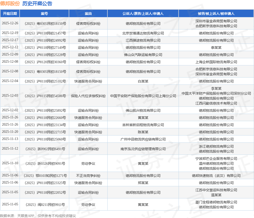 案号:(2025)沪0118民初25060号根据统计,近一年内以德邦物流股份有限公司为当事人的历史开庭公告有383则,其中案由为“快递服务合同纠纷”的公告以120则居首,其次为“运输合同纠纷”有76则,“劳动争议”有29则。历史开庭公告(前20条)如下: