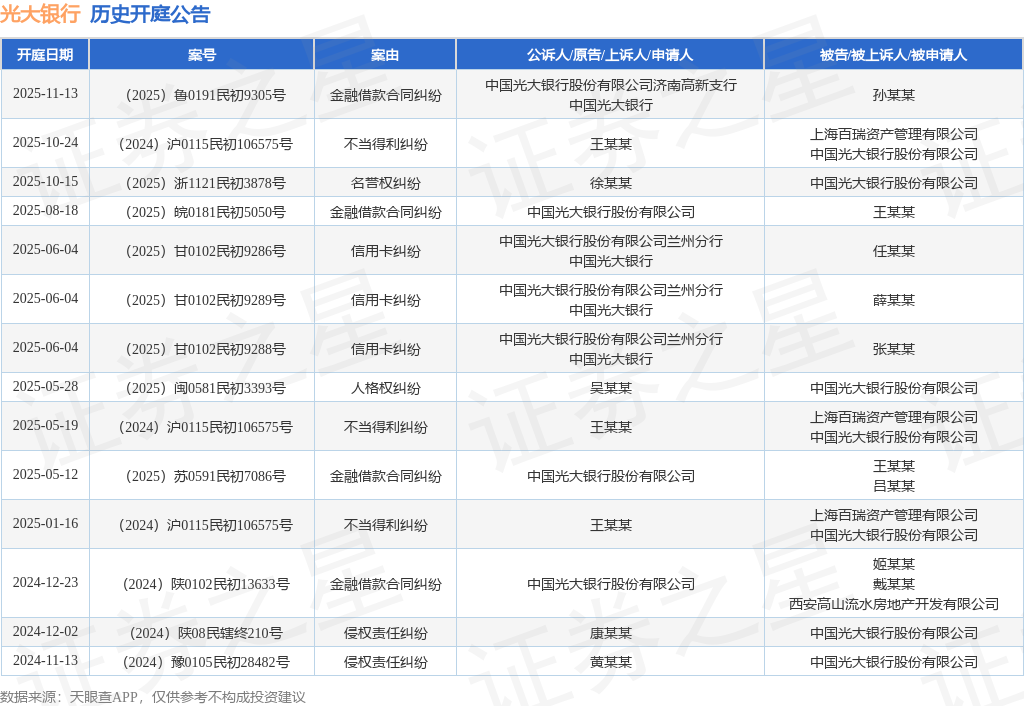 案号:(2025)鲁0191民初9305号根据统计,近一年内以中国光大银行股份有限公司为当事人的历史开庭公告有14则,其中案由为“金融借款合同纠纷”的公告以4则居首,其次为“不当得利纠纷”有3则,“信用卡纠纷”有3则。历史开庭公告如下: