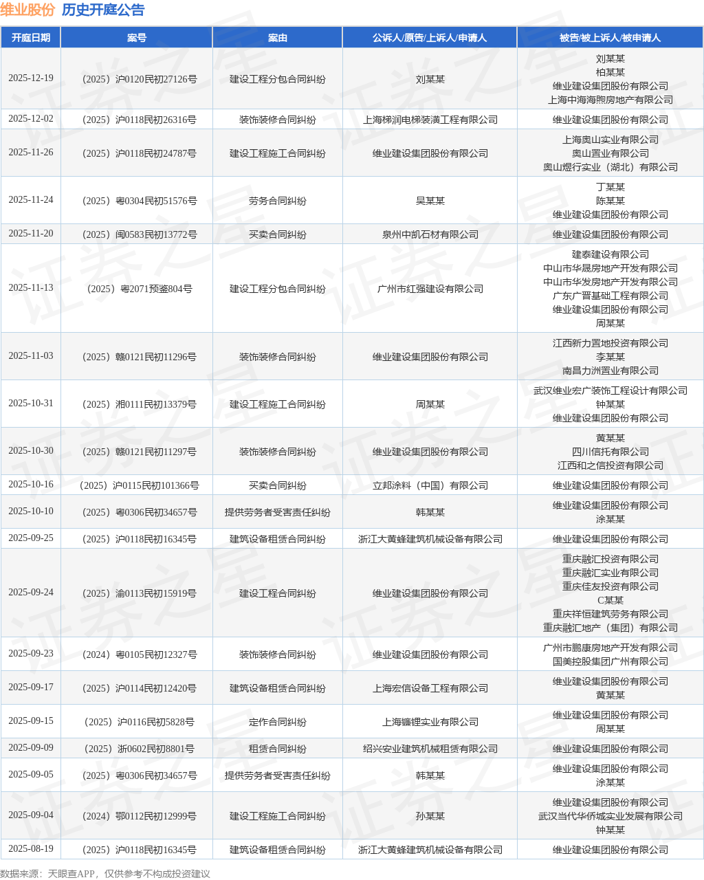 案号:(2025)粤2071预鉴804号根据统计,近一年内以维业建设集团股份有限公司为当事人的历史开庭公告有76则,其中案由为“劳务合同纠纷”的公告以18则居首,其次为“建设工程施工合同纠纷”有12则,“买卖合同纠纷”有9则。历史开庭公告(前20条)如下: